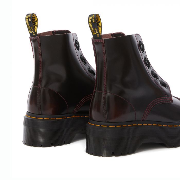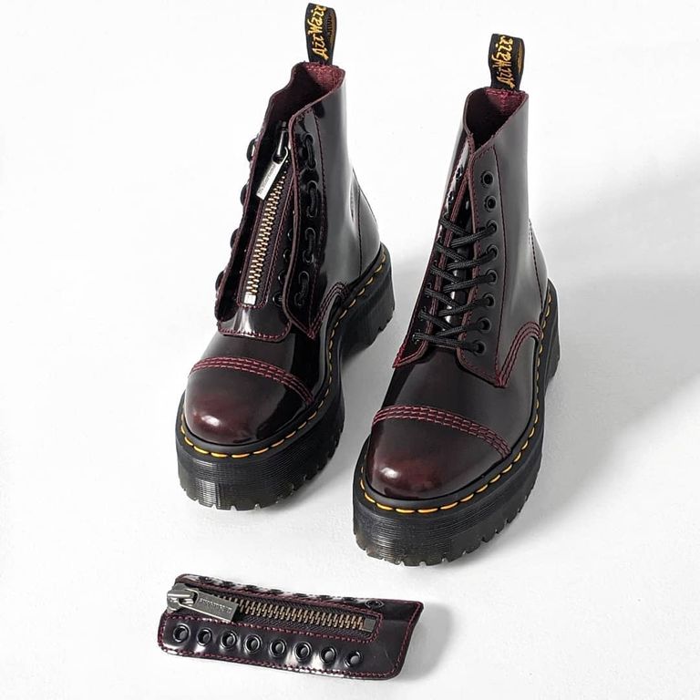 Обновлённые ботинки Dr. Martens бордовые на высокой подошве с двумя вариантами застёжки.